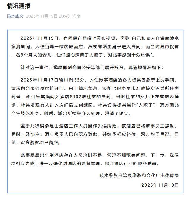 2025日,有网民在网络上发布视频,声称“自己和家人在海南陵水旅游期间,入住当地一家度假酒店,深夜有陌生男子进入房间,而当时房内仅有一个月大的婴儿,他们担心遭遇了人贩子,对此事感到十分恐惧”。
