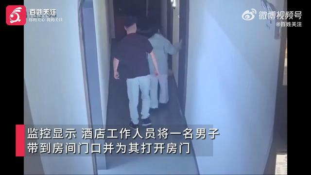 监控视频显示,一男子跟随酒店工作人员来到房间门口,询问男子后工作人员打开了房门。孩子父母称当时屋内有一名九个月大的婴儿正在熟睡,他们通过手机视频进行照看,发现情况不对才返回房间。